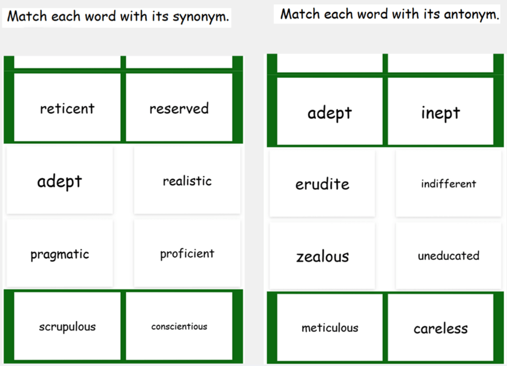Next, learn synonyms for quicker retrieval of words and meanings. Building these connections creates a web of associated words that helps you find the right one faster (Nation & Webb, 2021). Similarly, learning antonyms deepens these connections, ensuring recall of both similar and contrasting words when needed (Webb et al., 2020). Spend 4-5 minutes on the definitions and try to complete the dominoes game.