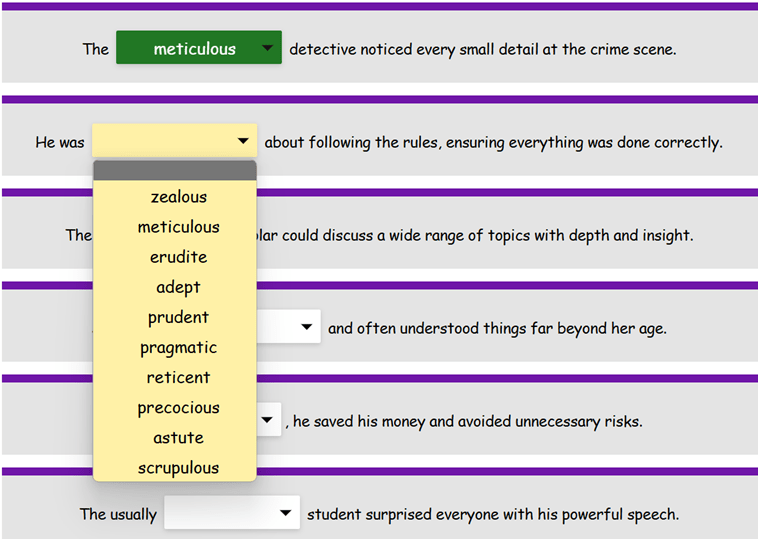 Practise vocabulary in context by filling gaps with the correct word, reinforcing understanding of synonyms, antonyms, and nuanced meanings effectively. Recent studies show that seeing how words fit into real-life sentences enhances our ability to use them correctly and reinforces memory (Ellis, 2020). In this gap-fill task, try to find the right word for each gap. You can add a clue indicating whether you need a word from the set, a synonym or an antonym. If played online, gap-fill can give instant feedback by allowing to select only the correct word.